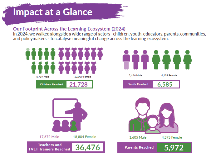 "We celebrate the many wins that brought us a step closer to our vision; and the challenges that, though demanding, strengthened our resilience. What connects them all is the enduring dream that, in our generation, Africa’s children and young people will read and understand stories, delight in playing with numbers, and grow in the life skills and values they need to navigate the world.''